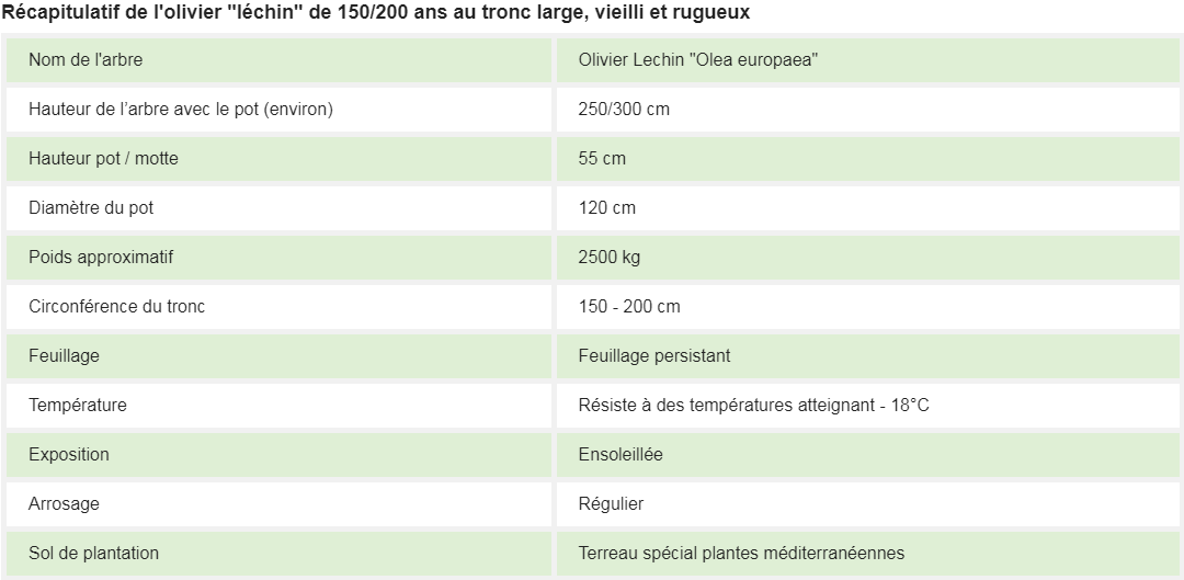 Cet olivier s’adapte très bien dans toutes les régions de France. Quand un olivier “léchin” de 150-200 ans est planté en pleine terre, il résistera à des températures pouvant atteindre -15°C.