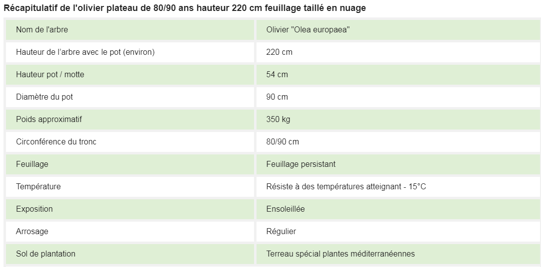 Cet olivier plateau s’adapte très bien dans toutes les régions de France. Quand un olivier de 80 à 90 ans est planté en pleine terre, il résistera à des températures pouvant atteindre -15°C.